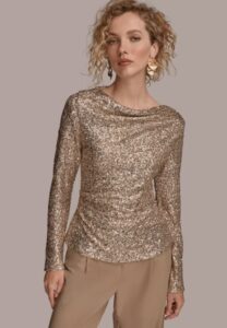 Now, this doesn’t have to be something with sparkle. Maybe you have a favorite lacey or ruffled top that doesn’t get much wear. That could be the main event, paired with simple bottoms, tailored pants or a midi skirt. But you could even wear it with a tailored suit. That would bring some of the “hard/soft” look I encourage for clients that emphasizes the softer item by contrast.